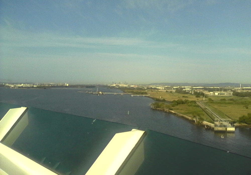 ブリスベン港 Portside Wharf Hamilton は海に面していなく、ブリスベン川を遡ったところにあります。 出港の時は川にかかるモーターウェイの橋をギリギリの高さで通過するので見ものです。 空港からはタクシーで20ドルくらいです。空港から街へ行く中間ぐらいの場所なので、前泊して観光されるといいです。