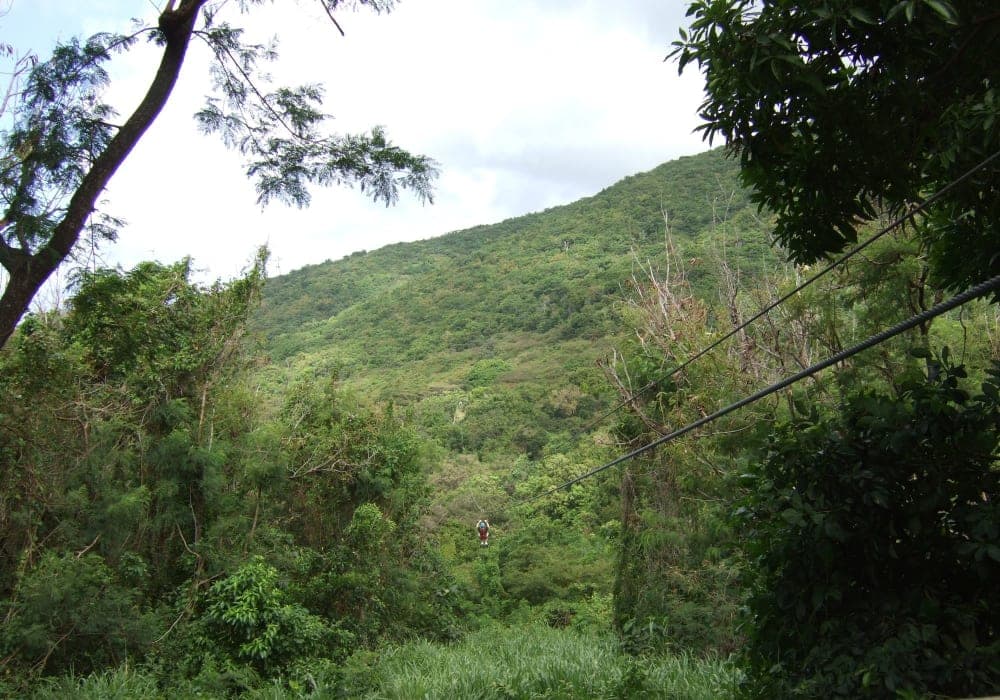 ジップラインツアーに参加しました。ツアーの事務所でハーネスを身につけ、スタート地点近くまで、トラックの荷台に乗ってガタガタの山道を登りました。ロープに滑車を取り付けて滑ります。青い海とうっそうとしたジャングルの緑を眼下に見ながら空を飛ぶように滑るのは気分爽快でした。