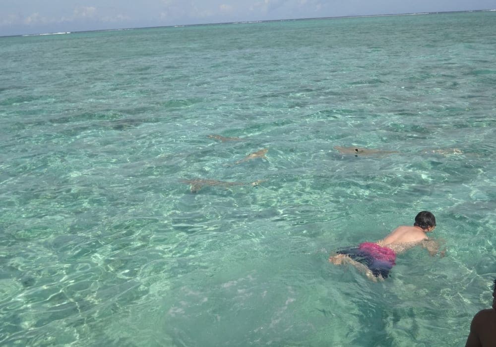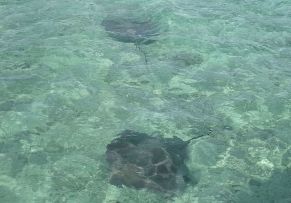 とても満足テンダーボートで上陸。シュノーケルのエクスカーションに参加。 今までのクルーズで訪問した海の中で、一番透明度の高いきれいな海であった。サンゴ礁に囲まれた海は遠浅で透明度が高く、シュノーケルのポイントでは50~100㎝位の大きさのエイや小型の鮫と一緒に泳ぐことができた。エイには触ることもできた。直射日光が強いので日焼け対策は万全に。