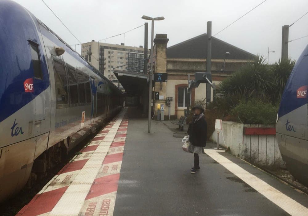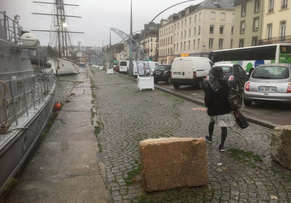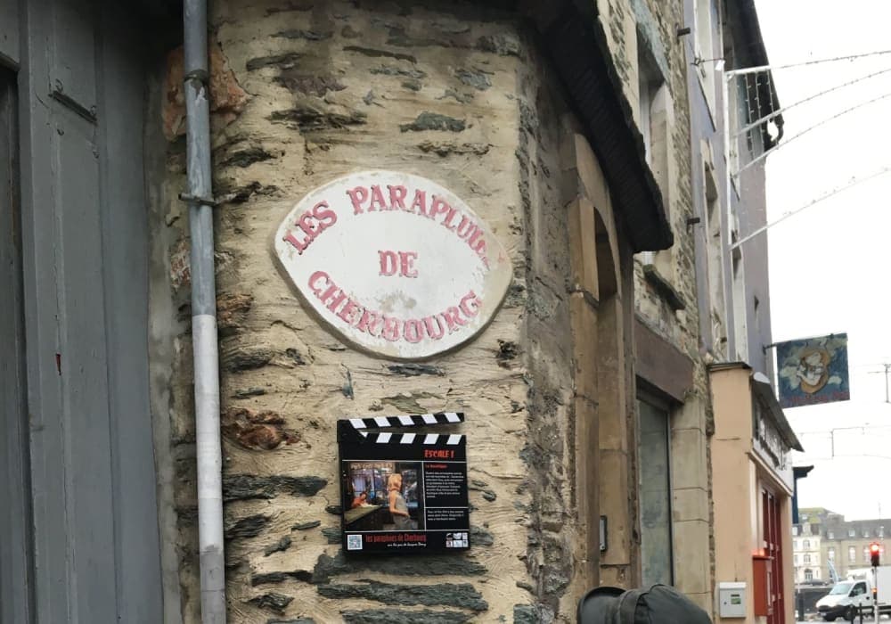 自分たちで、シェルブールの雨傘撮影地巡りを行いました。ジュヌビエーブ親子の雨傘店、結婚式を挙げた教会。宝石商と歩いた港の石畳、ギイと別れた駅のプラットフォーム。50年以上前の映画の世界の佇まいが残っており、楽しめました。映画で映る鉄筋コンクリートの高層アパートは今そのまま残っています。