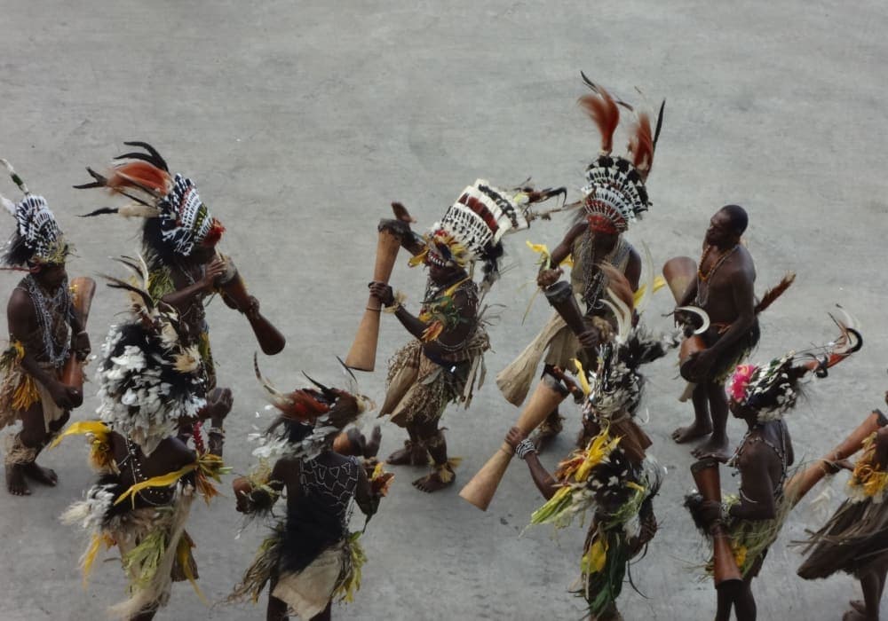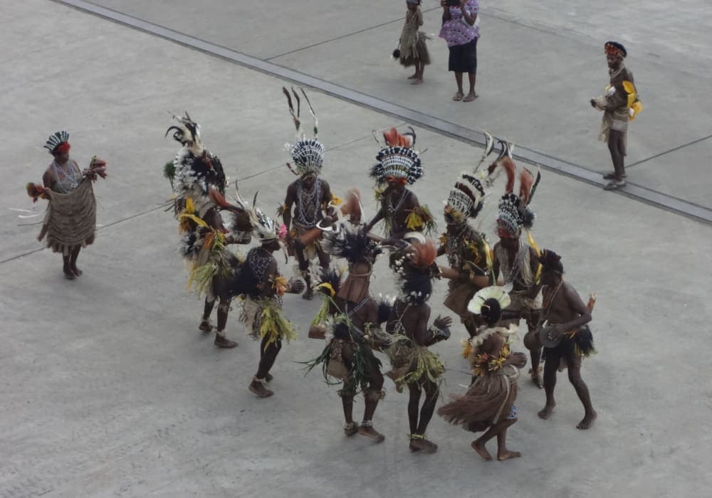 普通埠頭から村のお土産屋さんまで海岸沿いをゆっくり歩いて片道20分、往復歩く。沿道では民族衣装を着た親子が写真撮影しませんかと立っている。もちろん有料。車道は舗装してあるが民家につながる脇道は赤土の道。小学校時代の通学路を思いだす。湿度が高い。出港時は現地の人がパプアニューギニアの踊りで見送ってくれた。感謝。
