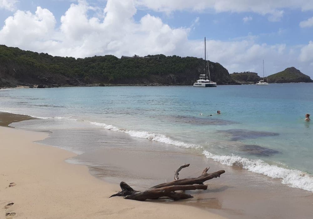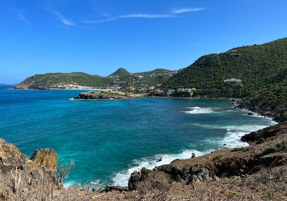 ボートまたは徒歩しかアクセスできないコロンビエ・ビーチに行きたかったので、港からタクシーで行こうとしたらツアー客が優先されなかなか順番が来なかった。久しぶりの客船の寄港で現地のバス・タクシーも対応に手間取っている様子。船側で手配したツアーの方でもかなり待たされていた。 1時間も待たされてからタクシーでビーチ近くの村へ行き、そこから岩だらけのトレイルを歩いてビーチまで。途中、野生(放牧?)の山羊や陸ガメに遭遇。岩山から眺める入り江や小島も美しく、苦労した甲斐があった。ビーチもとても美しかったが、石ころ、岩が多いので水に入る時はアクアソックスなどが必要。