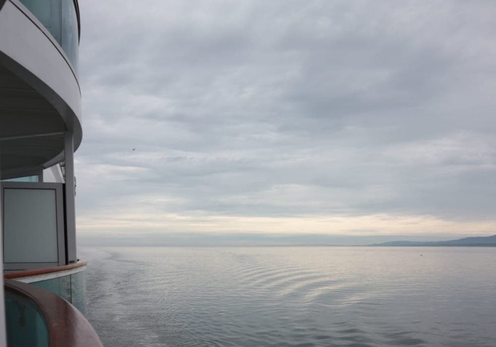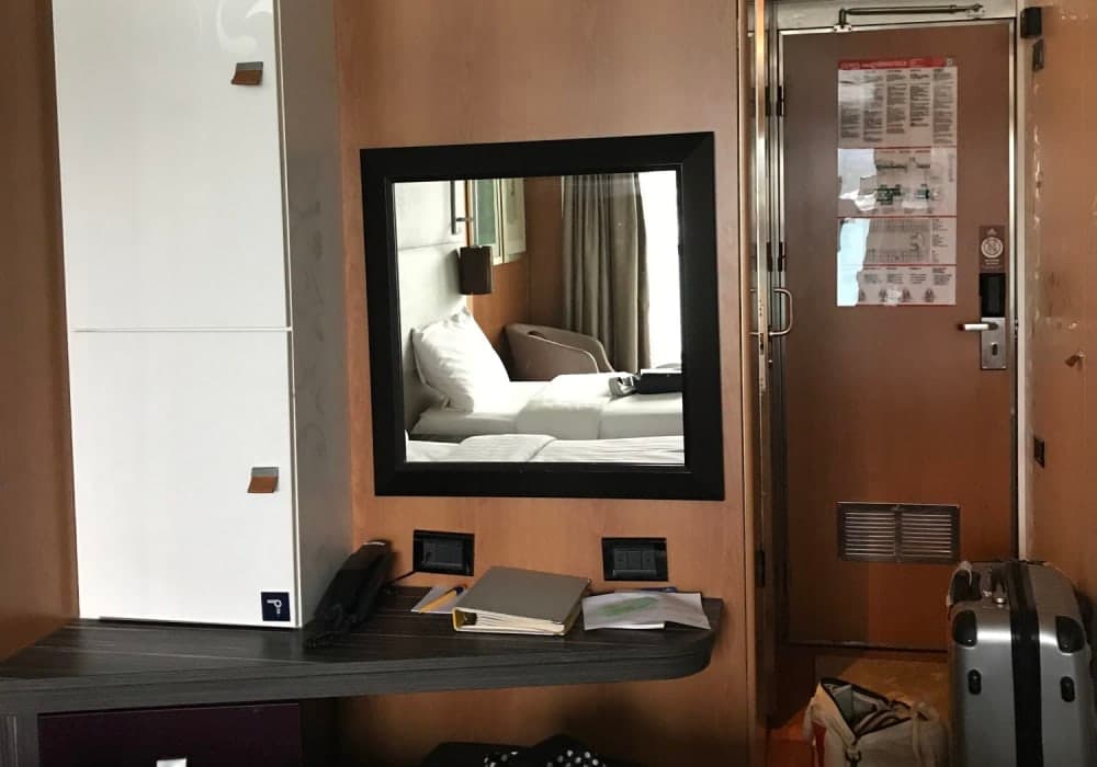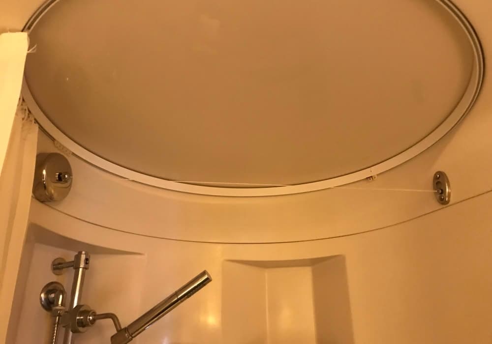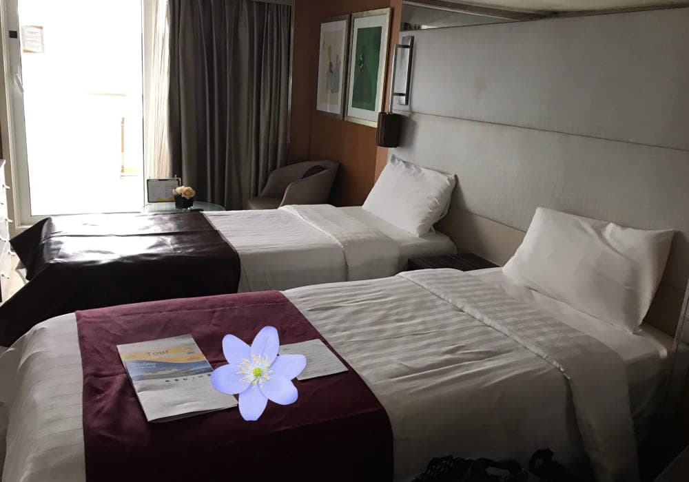 海側キャビンだったが、見晴らしの良い6階で、収納も多くて良かった。 ベッドの下は大型のスーツケースも楽々入り、部屋を広く使えた。 シャワーだけが丸型で狭くて、バスルームが水浸しになった。でも排水が良く、直ぐに乾いた。