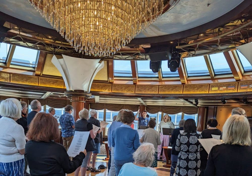 ロイヤルコートシアターのショーはいつも素晴らしい。この船の魅力は、内装等ハードと音楽とショー。食事のことなんか気にならなくなるほど。日本周遊クルーズと違い、今回のクルーズでは乗客合唱団が結成され、シアター出演のプロシンガーが連日指導。バンクーバー到着2日前に、あのクイーンズルームで他の乗客を前に楽しい発表会があり...