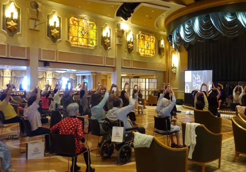アクティビティと言えるものはダンス、体操、講演が中心。 シャッフルボードなど一部のゲームでシールを集めて景品を貰おう!みたいなものもありましたが、参加者は少なめでした。 今回、キュナード目玉のフェンシング教室は無かったような・・・ 弦楽三重奏(リードバイオリン)、コミックバンド(ボーカル1名のみ)、クラシックのピ...