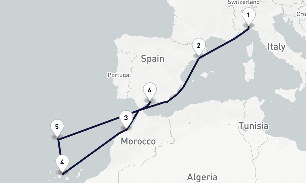 9日間 / 8 nights / 9 days, one-way from Genoa to Malaga
