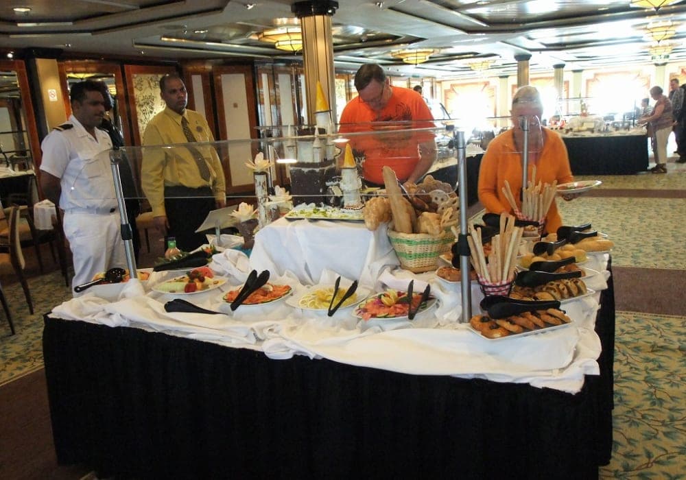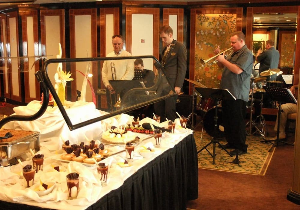 期待して、有料の寿司バーに行ったがこれが全く口に合わなかった。昼食時、後方デッキで設けられるバッフェスタイルの食事は生演奏も楽しめたので、評価できる。要するに何処のレストランが自分に合うのか、早い時点で見つけ出すのが大事である事を知った。お金をである出せば美味しいと言う事ではありません。