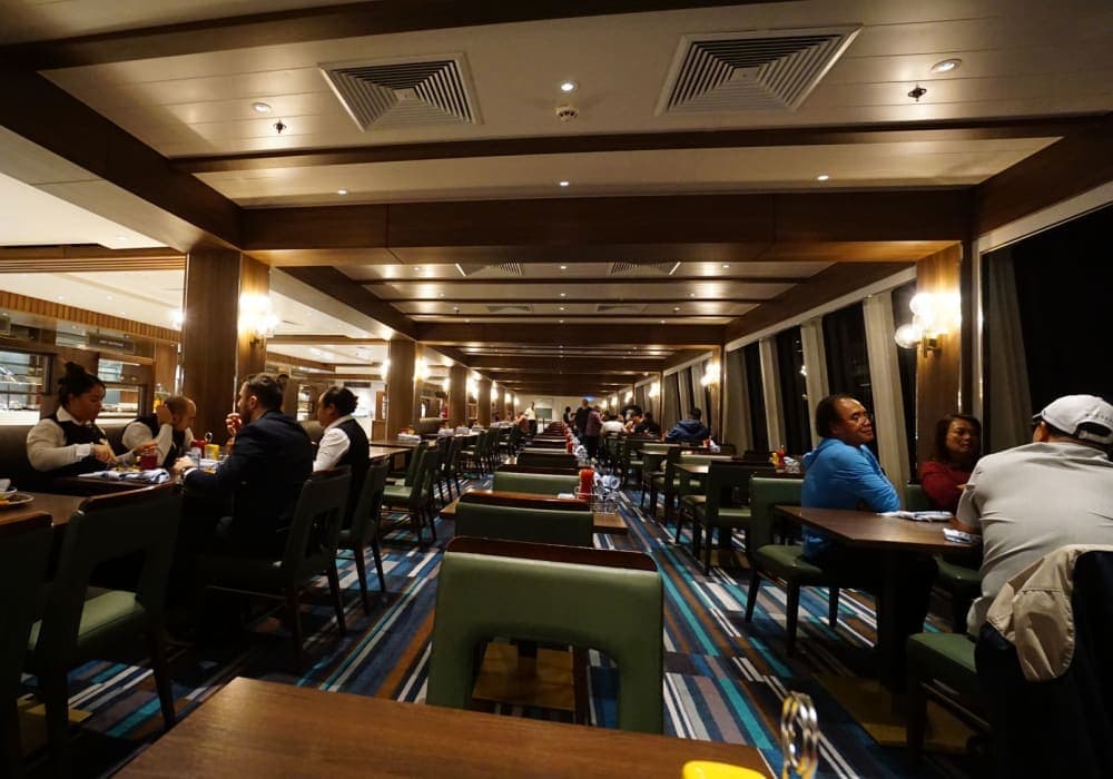 食事はカジュアル船で期待していなかったが、ダイニングの雰囲気はそんなに悪くなかった。たで、肉が硬い。最初ミディアムレアでも切れない程だったので2回目はレアにした。味は普通だがそれでも硬かった。又、ディナーでもコーヒー類がでない