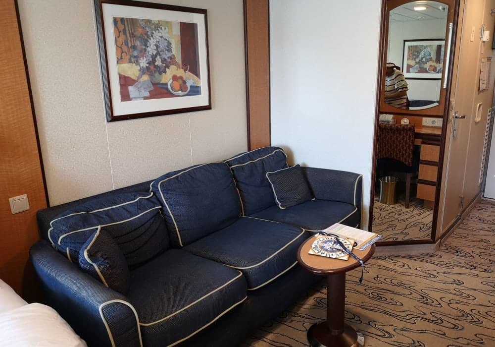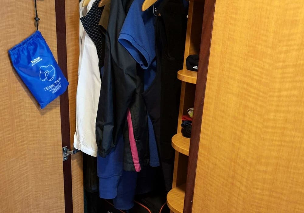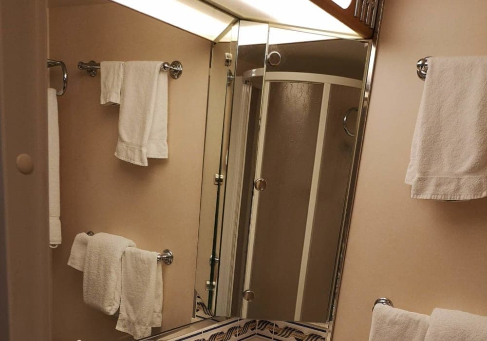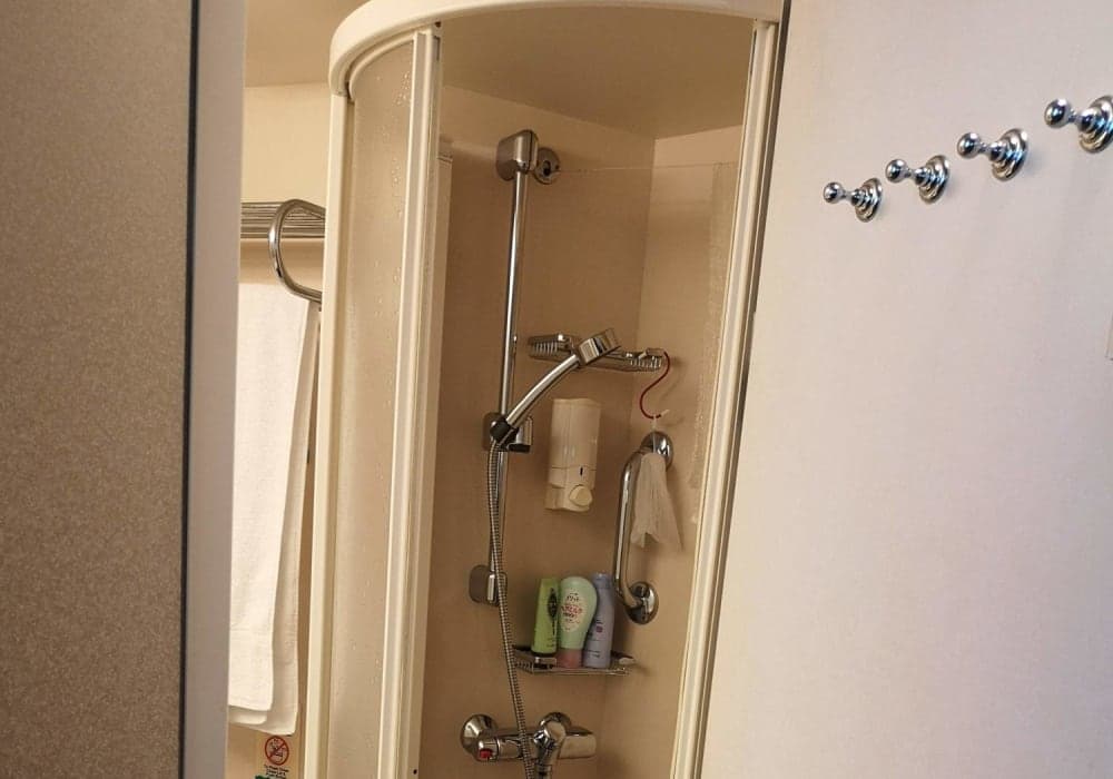 いつもベランダ付を利用している。広さはまあまあだ。お風呂場もバスタブがないのは残念だが、シャワー室の狭さにも慣れた。返ってあの狭さで体がとても温まる。下船してから宿泊するホテルで手足を伸ばしてバスタブに入るので1週間くらいは我慢する。