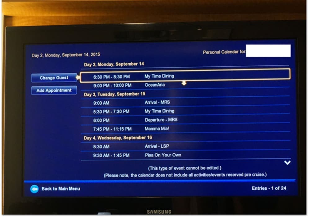 今回のキャビンは、海側ではなくボードウォーク側のバルコニー付き客室で バルコニーからはアクアシアターが臨め、部屋にいながらショーを楽しむ事が出来ました。 また、キャビン内のテレビでも予定が分かるようになっていて、とても便利でした。 ルームサービスも、キャビン内のテレビからボタン一つで注文出来ました。