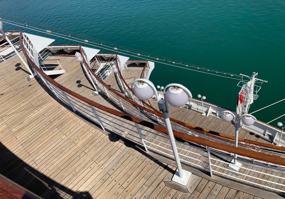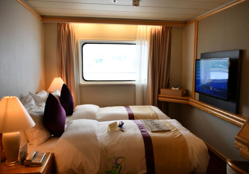 飛鳥IIには2度ほど乗船しましたが、いずれも2泊3日のコース。これではクルーズの楽しみとしては実質1日ちょっと程度。(乗船日の数時間と2日目。最終日は朝食を除けば下船だけ) 飛鳥IIのクルージングを十二分に楽しみたく、少し長めのクルーズを選択しました。全区間乗船すればかなり割安なプランです。更には前回の乗船で海側...