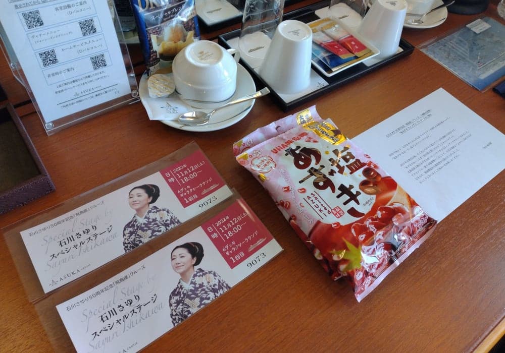 2022年9月の初飛鳥2クルーズが思いの外楽しく、また何かあればと探したところ日程が合う週末&ショートを見つけたので乗船10日前に申し込み。 石川さゆり50周年には全く惹かれないけれど、日本を代表する演歌歌手ということもあり私でも知ってる曲もあるのでちょっと楽しみ。 石川さゆりの他、このクルーズには飛鳥座を企画し...