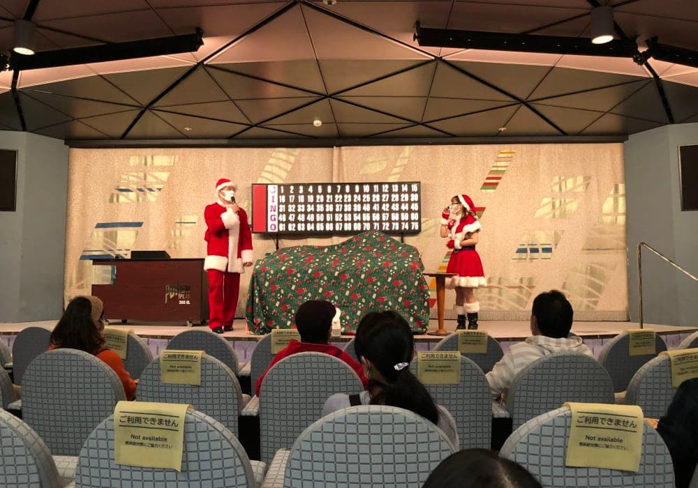 2泊3日と言うこともあり、船内ではゲーム大会を始めクリスマスガーランド作成教室などのアクティビティが複数行われていました。 密対策で、出港セレモニーが無かったのは残念でした。緊急避難訓練もソーシャルディスタンスを取りながら行われるなど、配慮されていました。 船内は各所で改装が行われていました。最も注目されるのは露...