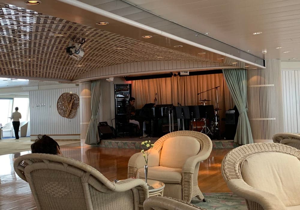 このクルーズはジャズ演奏も楽しみでした。 シアターでの小曽根さんのピアノ、素晴らしかったのですが、終わってからまたラウンジで、若いミュージシャンと一緒にドラマまで叩いてくれて、お話もできて感激でした。 クルーズではこんな事も特別に体験できるのがいいですね。