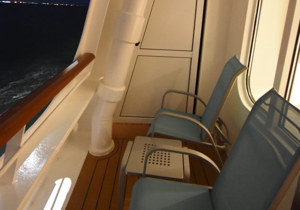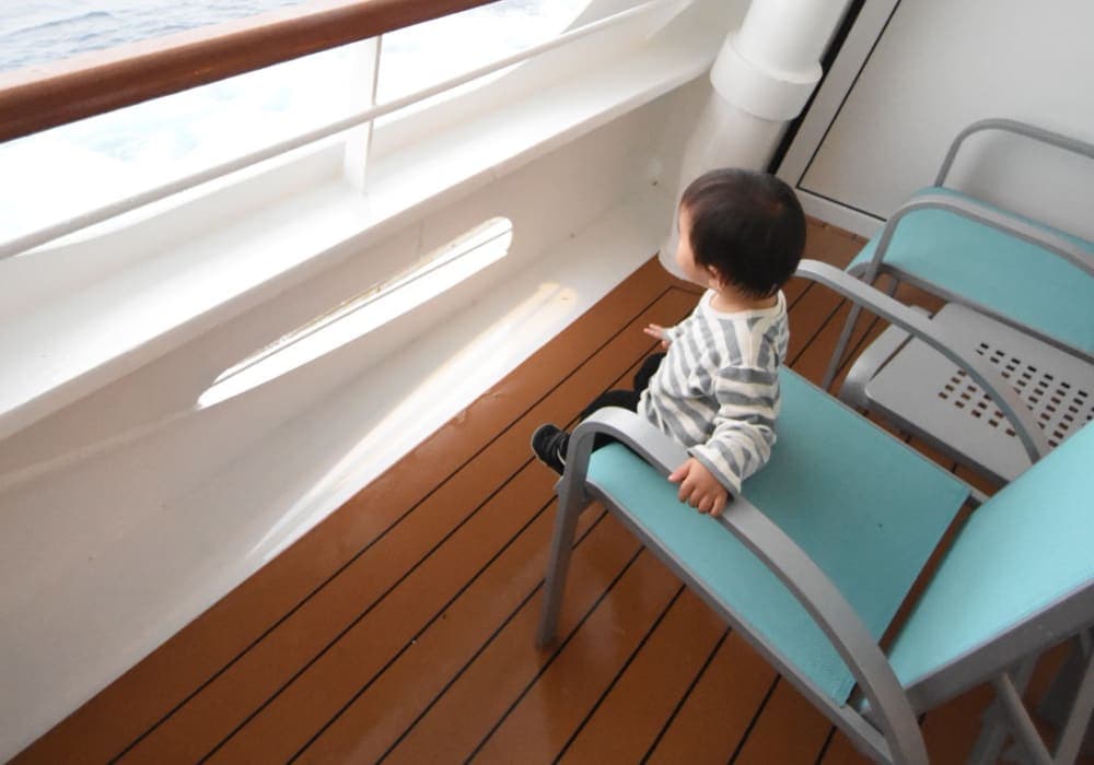 バルコニーでは朝のルームサービスが楽でした。出航時にお部屋から景色が見られるところも醍醐味です。