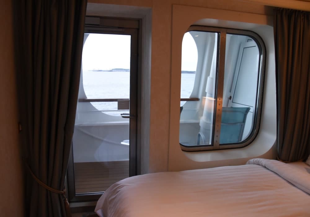 今回は海側船室と海側バルコニーに宿泊しました。 基本的には一般的なクルーズ船の標準船室同様ですが、新造船なだけあり調度品も真新しく使用感もあまり無くとても気持ちよく過ごすことが出来ました。 又特筆することは海側船室にはシャワールームとは別にバスタブがあったことです。 一般的にこのクラスのクルーズ船ではスイート船室...