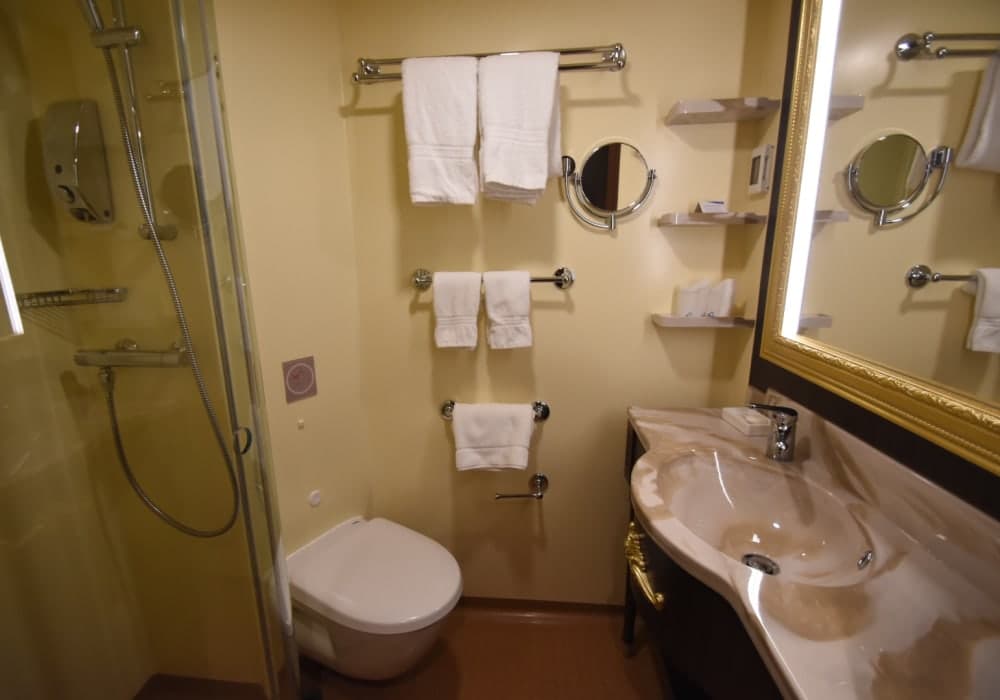 新しく、シャワーブースもカーテンではなくクリアドアがついていてよかった。洗面台は他の船よりかなり狭く感じた。