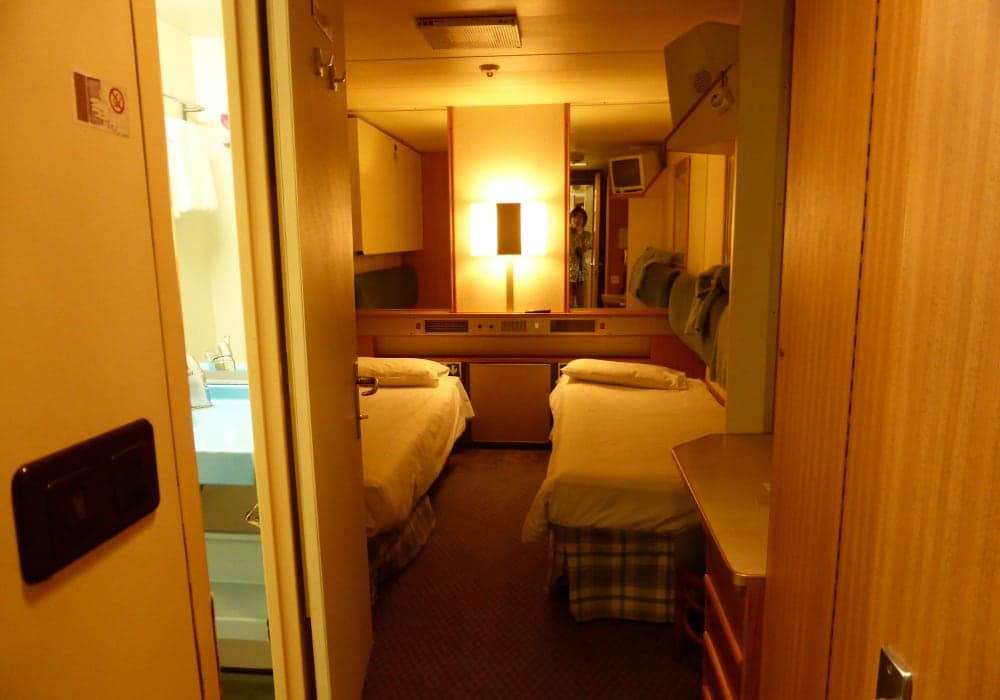 普通今回は一番安い内側客室を利用した古い船なので客室の広さは10㎡とかなり狭くスーツケースを開けるのにも苦労した(カーニバルクルーズの内側船室は17㎡) また下の方のデッキだったのでエンジンの振動がかなり伝わってきたので神経質な人は眠れないであろう。 ちなみに窓側の客室も見たがベッドがL字型にならんでおりこちらもかな...
